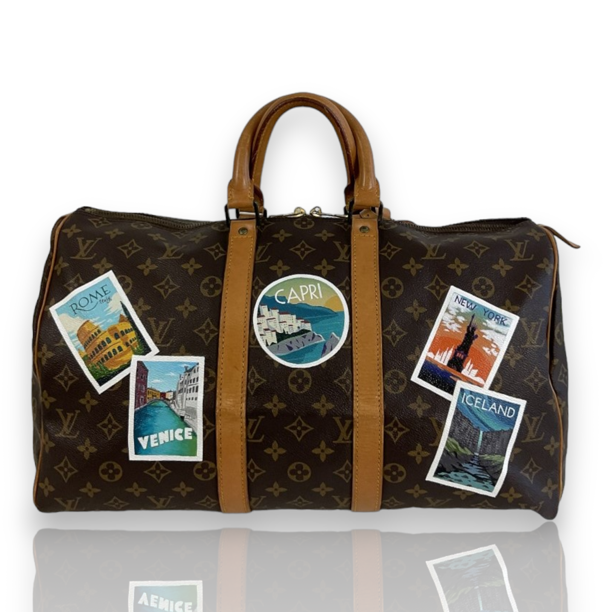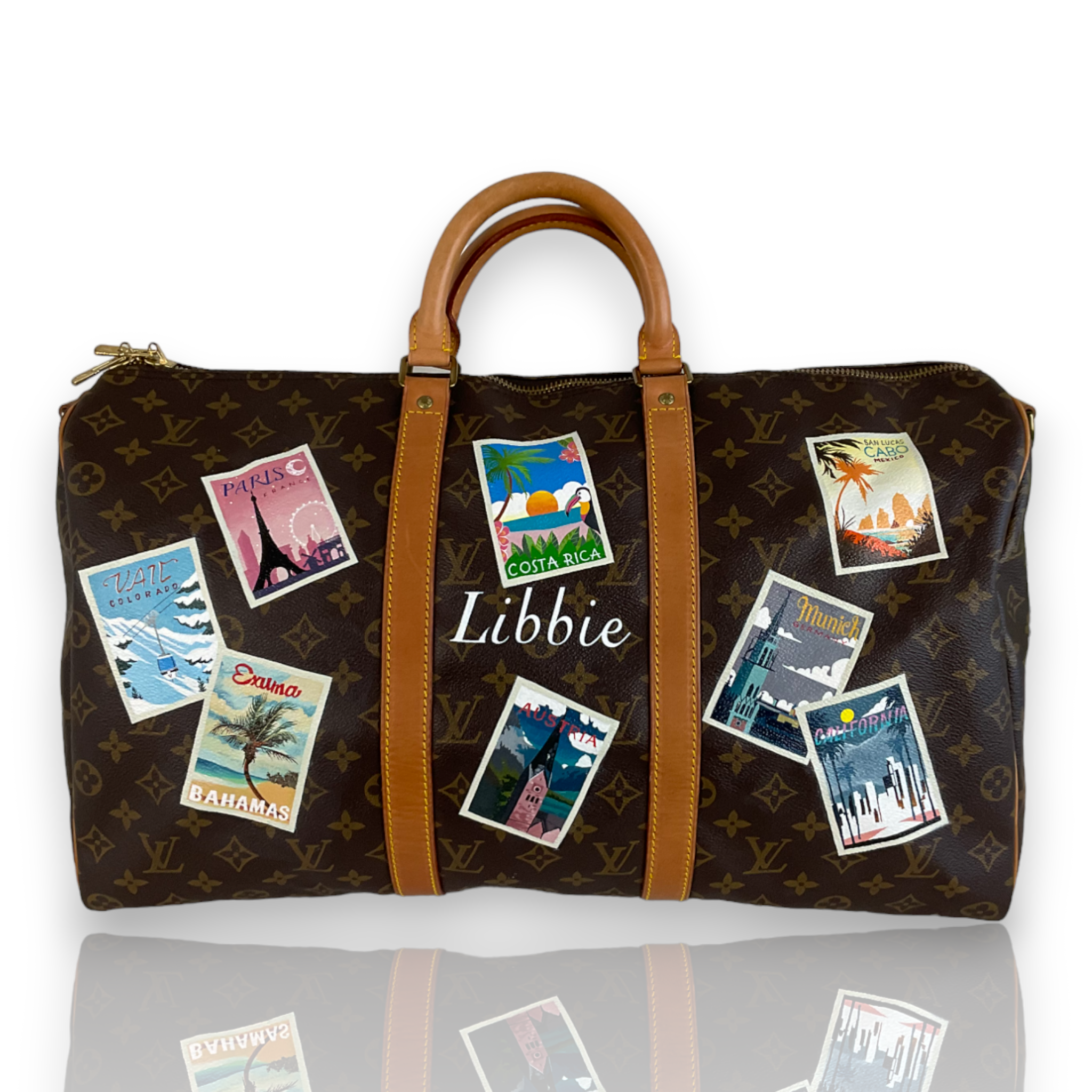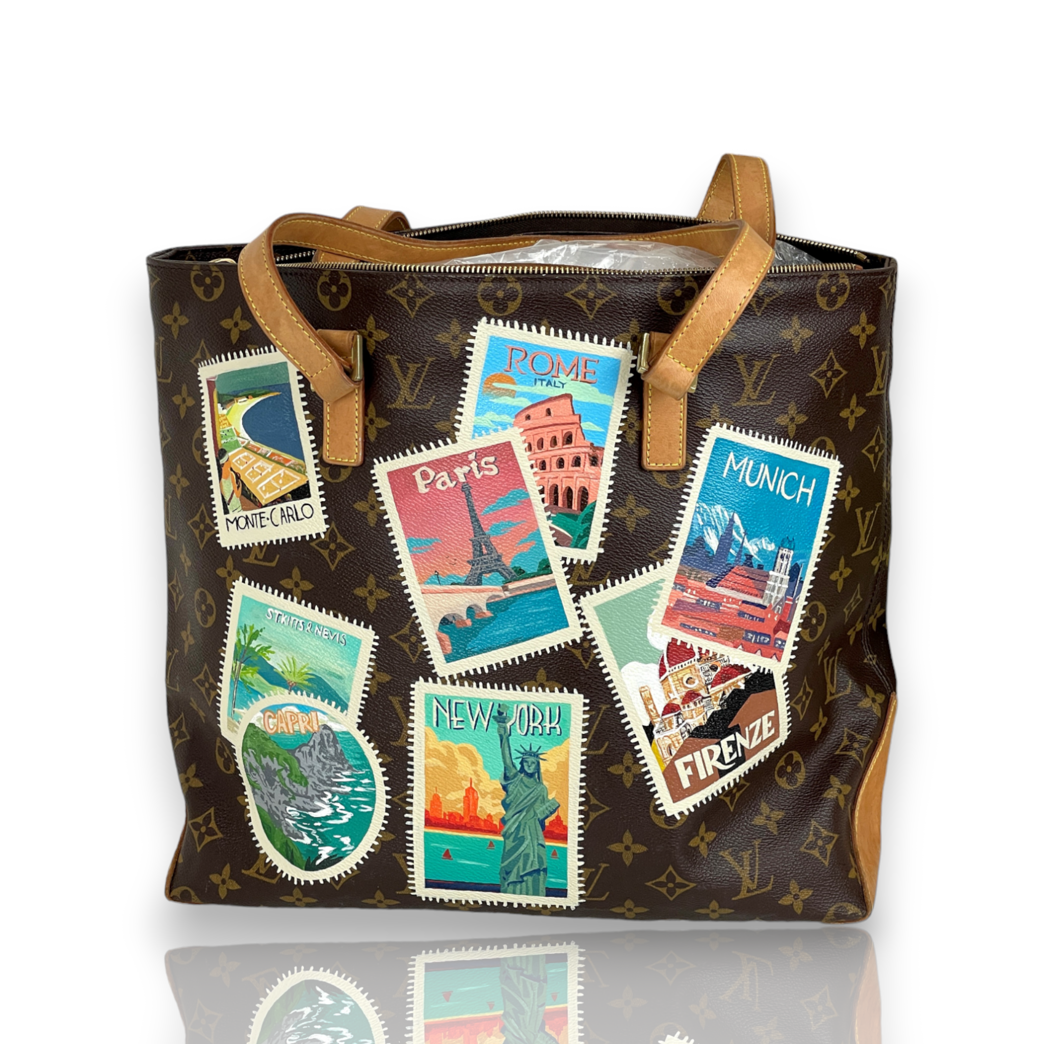 A handbag adorned with personalized travel stamps, painted onto its surface, captures the essence of your own cherished memories, turning it into a unique and sentimental accessory that tells the story of your own incredible adventures. Carrying this bag allows you to keep your treasured travel experiences close to your heart, wherever you go.