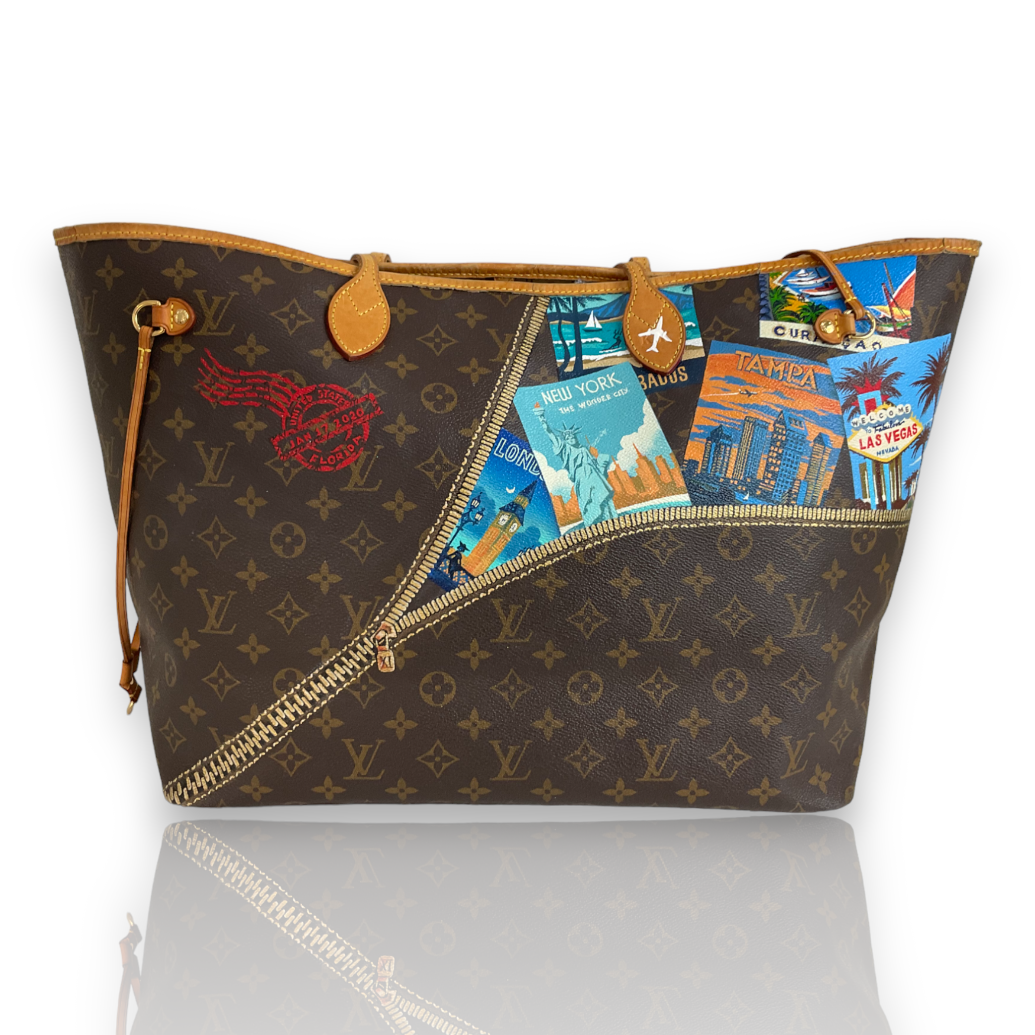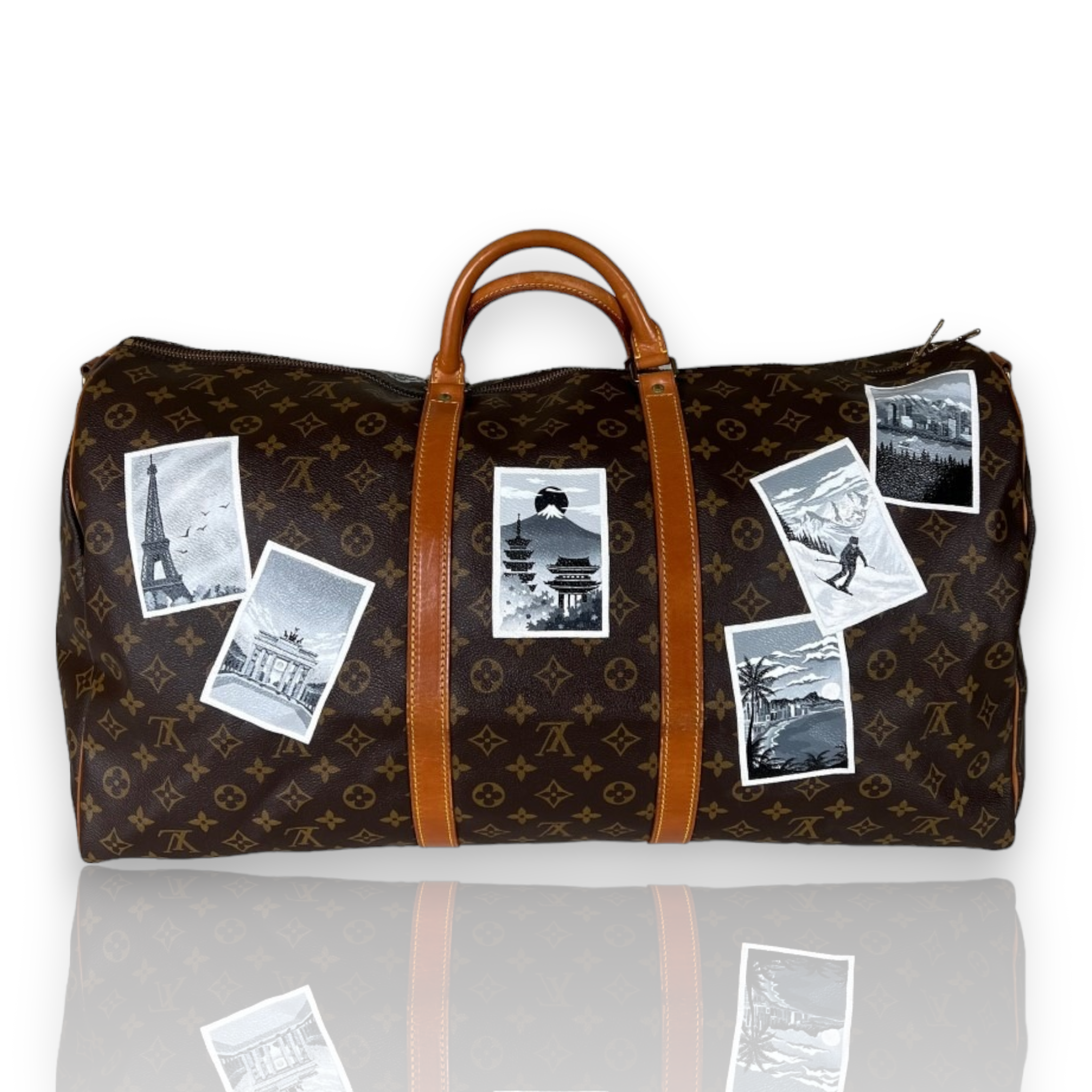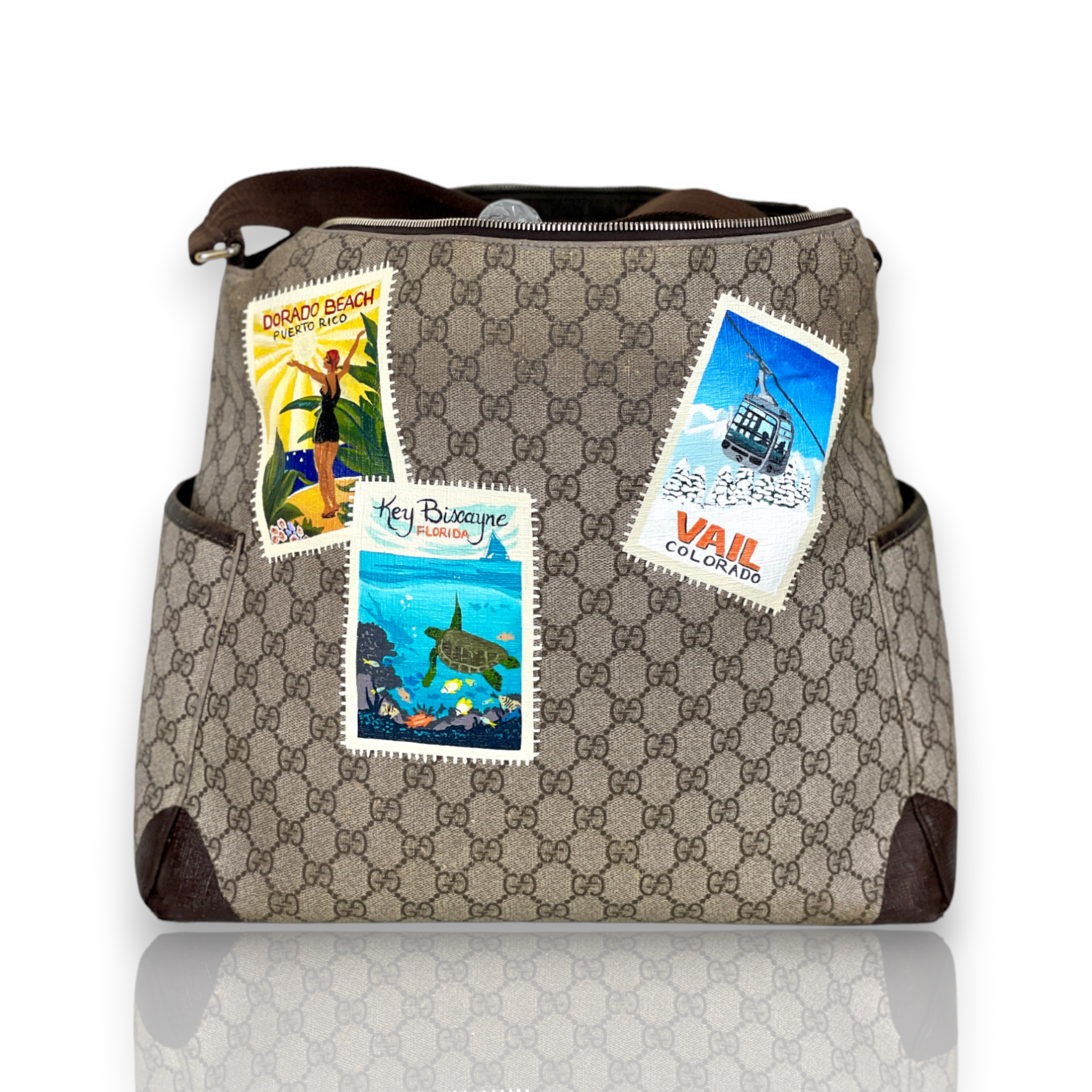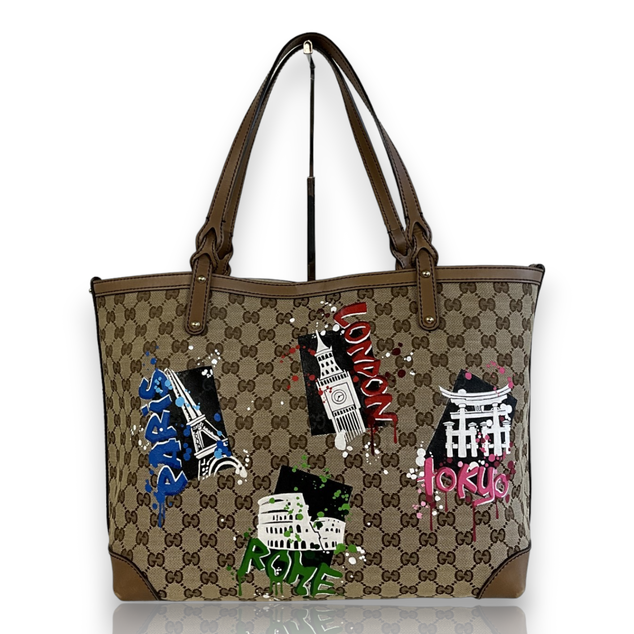 A handbag adorned with personalized travel stamps, painted onto its surface, captures the essence of your own cherished memories, turning it into a unique and sentimental accessory that tells the story of your own incredible adventures. Carrying this bag allows you to keep your treasured travel experiences close to your heart, wherever you go.