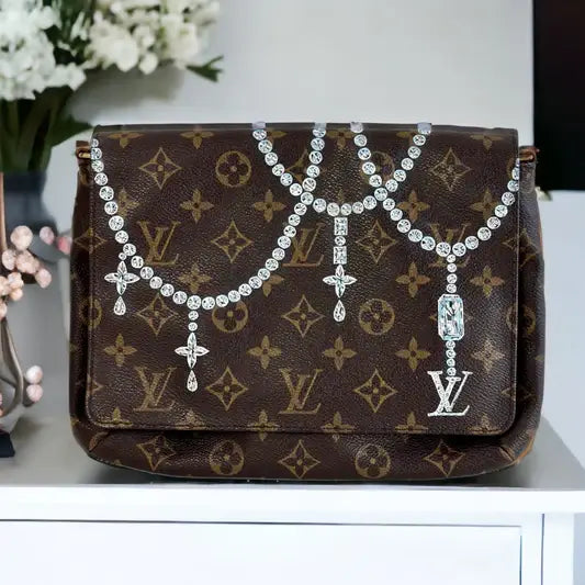 Where elegance meets enchantment. This hand-painted, preloved Louis Vuitton Tango glows with painted diamonds and pearls—made to captivate from day to night.