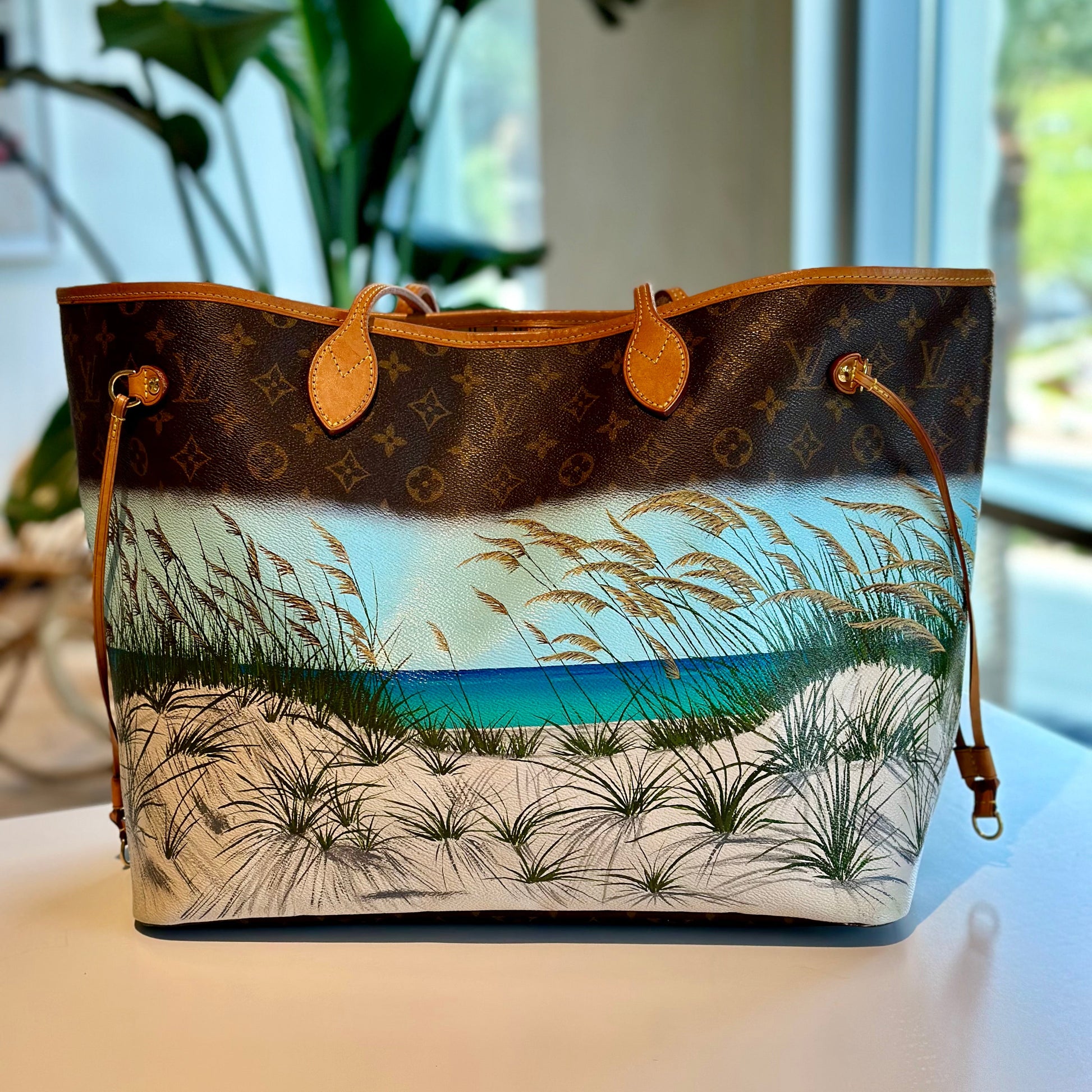 This pre-owned Louis Vuitton Neverfull beautifully blends classic elegance with artistic flair, featuring a hand-painted beach scene. "Beach Time" offers a refined yet subtle addition to any discerning travel enthusiast's wardrobe. Inspired by the sun-kissed shores of Rosemary Beach on 30a, where our founders Stephanie and Candace reside, this piece is destined to remain a cherished favorite for years to come.