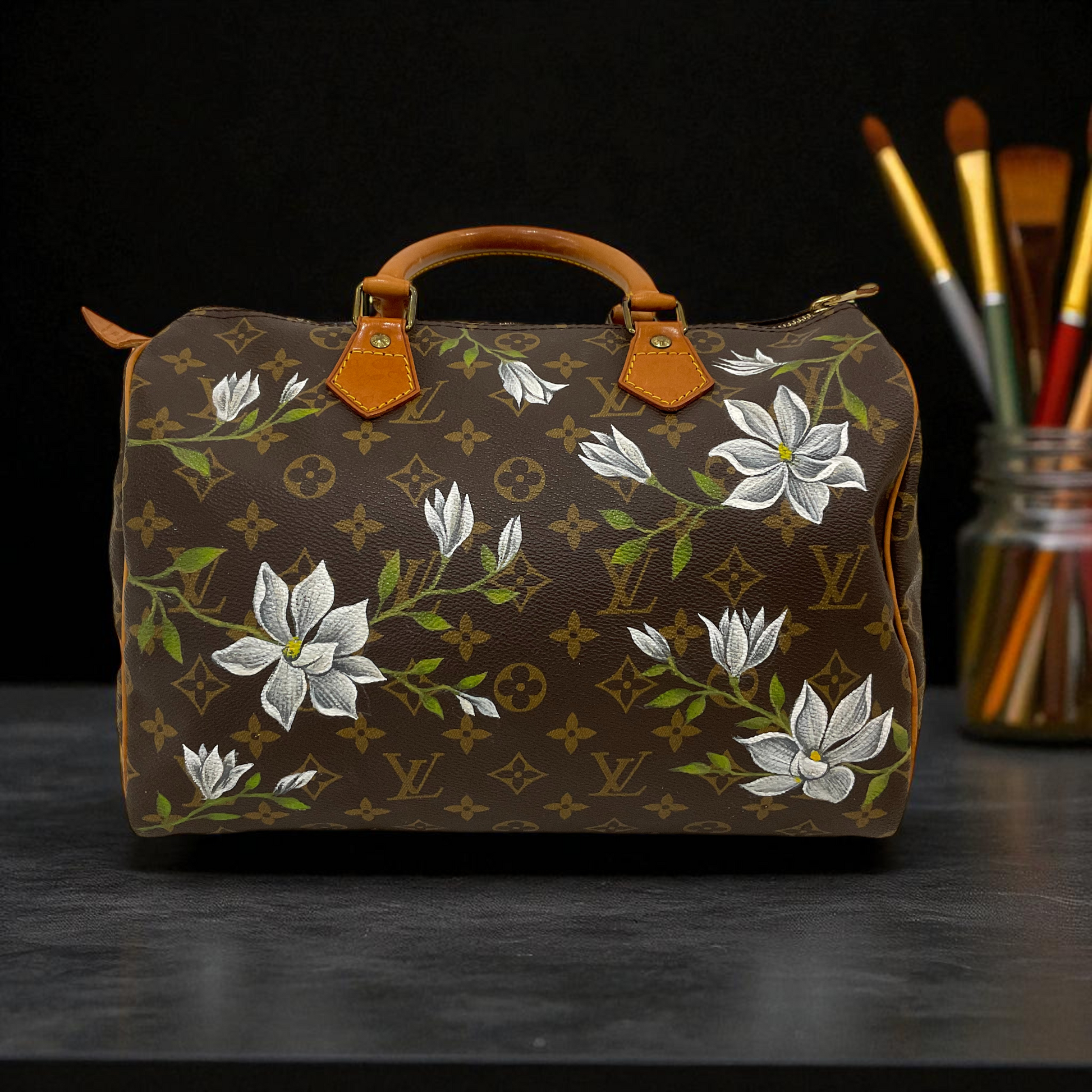 A refined Louis Vuitton transformed with sleek, hand-painted detailing that celebrates timeless style and understated sophistication.