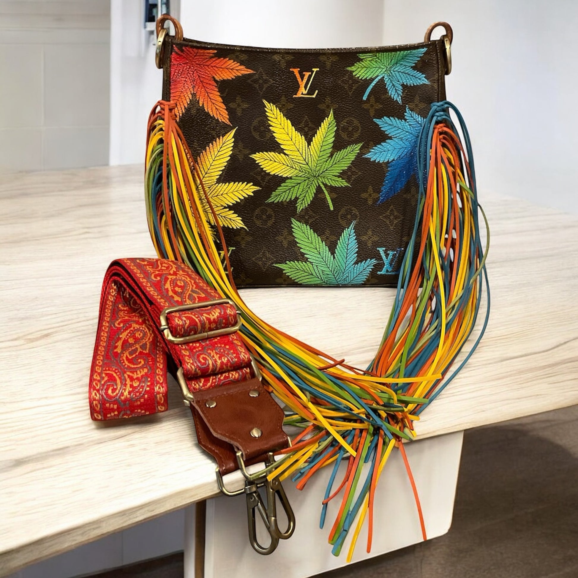 Boldly expressive with a luxe twist, High Class features hand-painted "botanical" leaves on the iconic Louis Vuitton Looping bag. Finished with vibrant, multicolored fringe, it’s a daring blend of elevated style and unapologetic individuality.