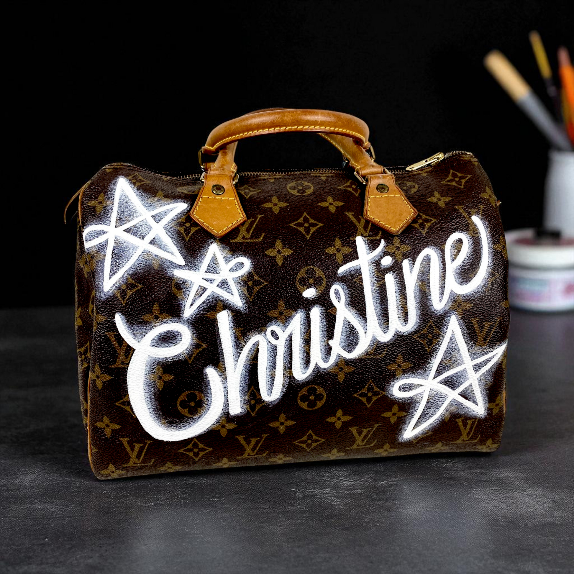 My Name in Spray Paint transforms the iconic Louis Vuitton Speedy into a striking canvas of urban artistry. This bold, hand-painted design showcases graffiti-style lettering that injects a fresh, streetwise edge into a timeless silhouette. Meticulously crafted, the piece merges luxury craftsmanship with rebellious spirit, making it not just a handbag but a wearable statement of individuality and contemporary culture. Perfect for those who appreciate the fusion of classic elegance and avant-garde expression, this bag elevates everyday style into a dynamic art form.