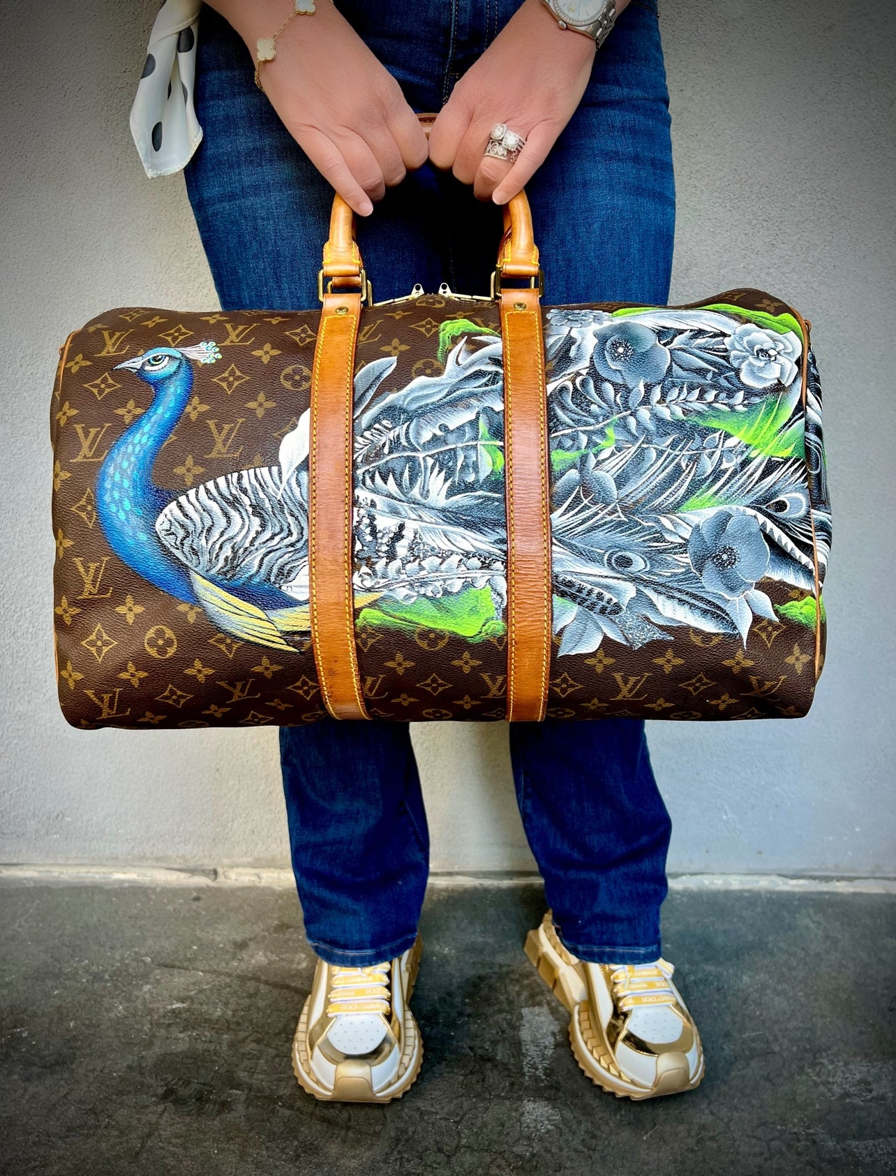 Bold and elegant, Captivating Peacock features a hand-painted peacock in rich, vibrant tones on the classic Louis Vuitton Keepall. A true showstopper with timeless style.