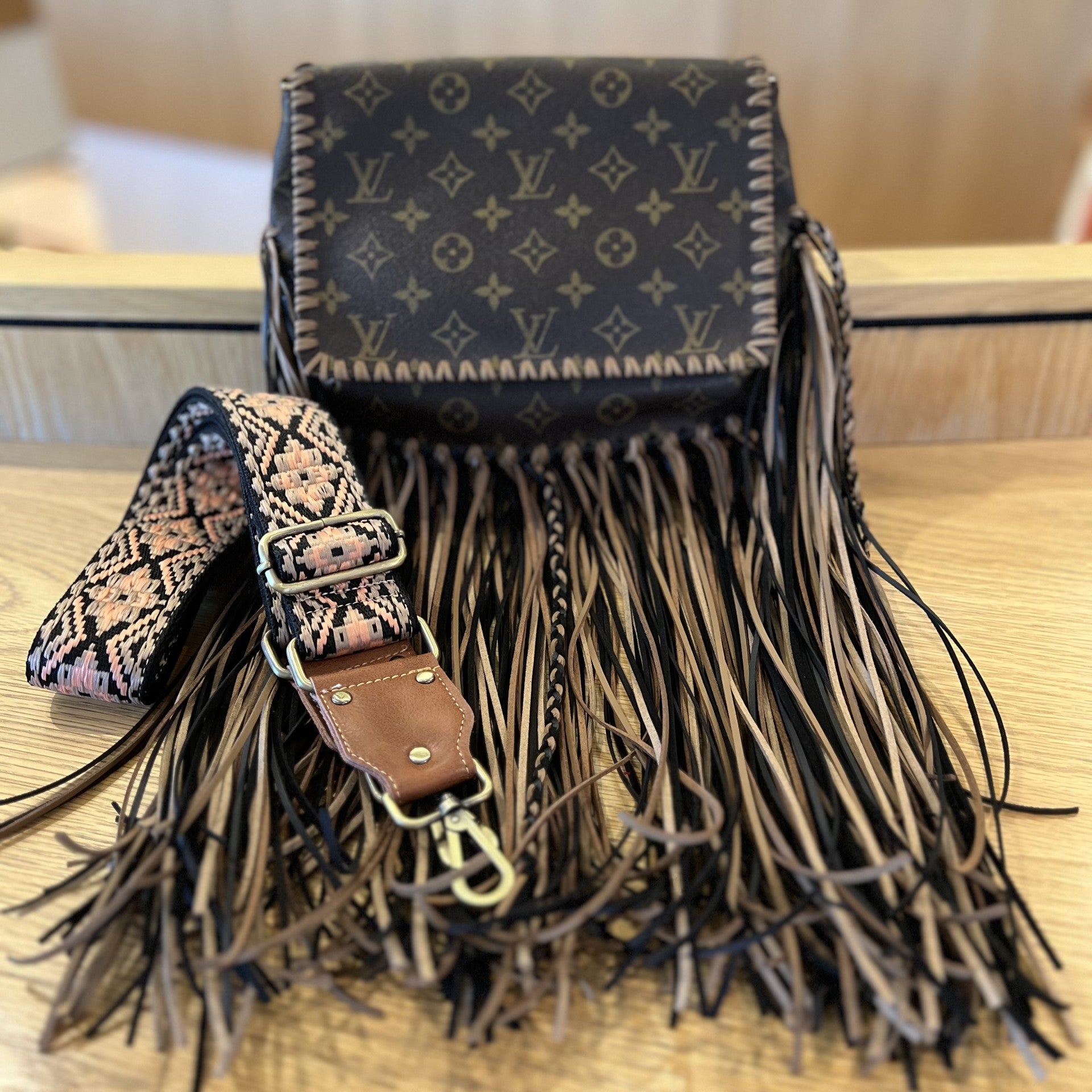 This refurbished Louis Vuitton Tango is updated with delicate, hand-crafted needlework and an eye-catching, flowing fringe.