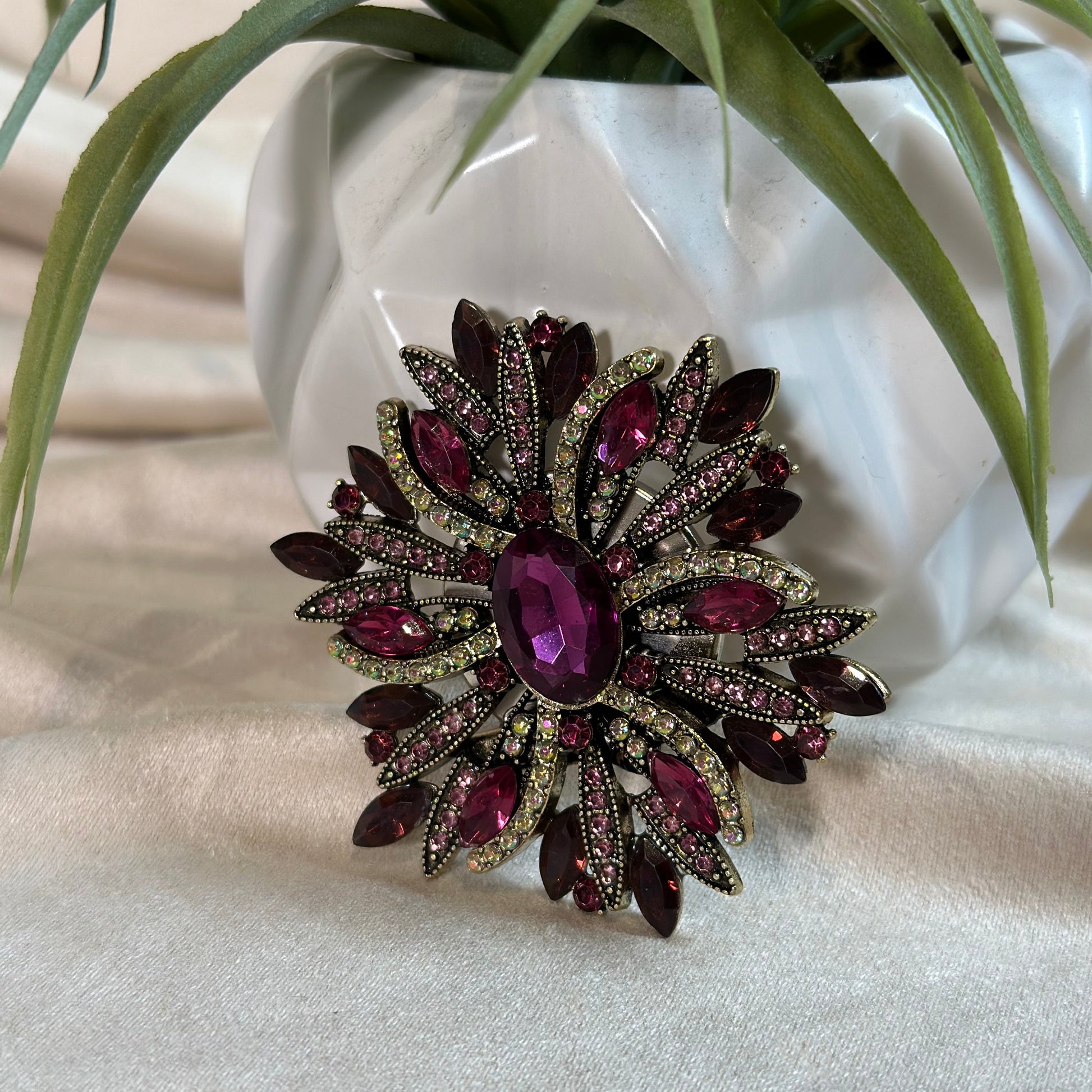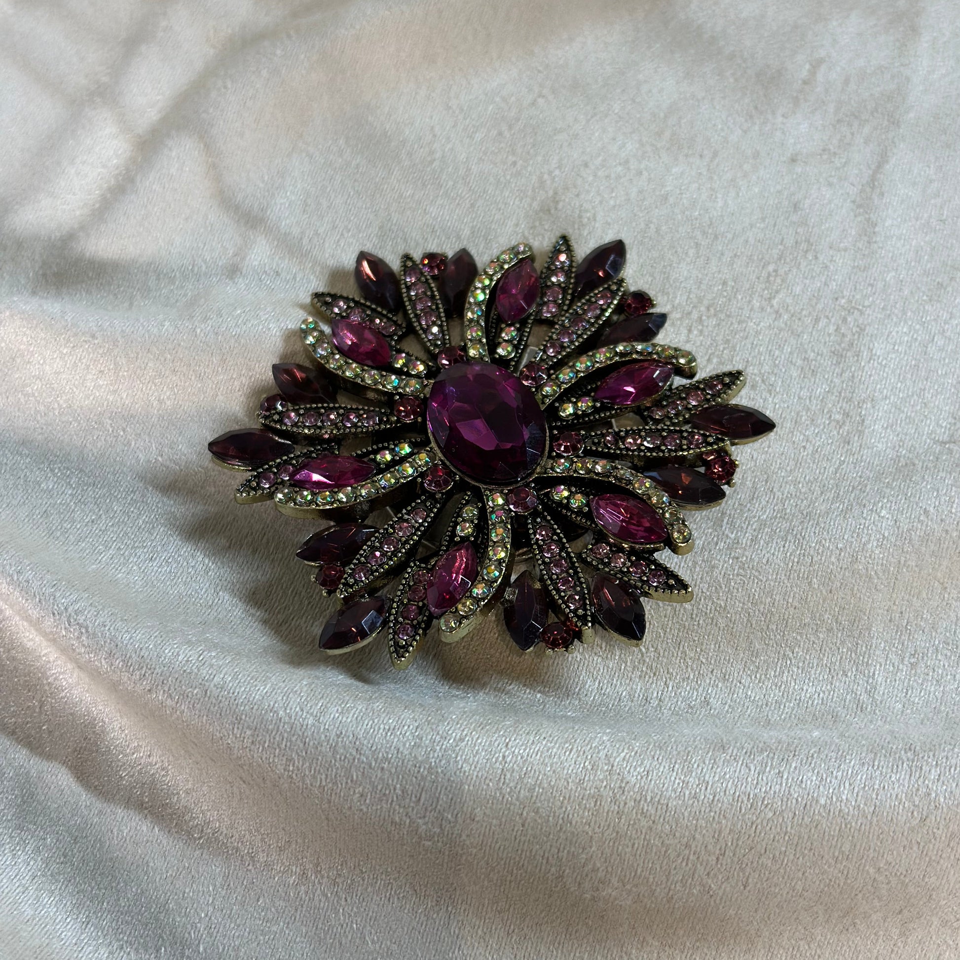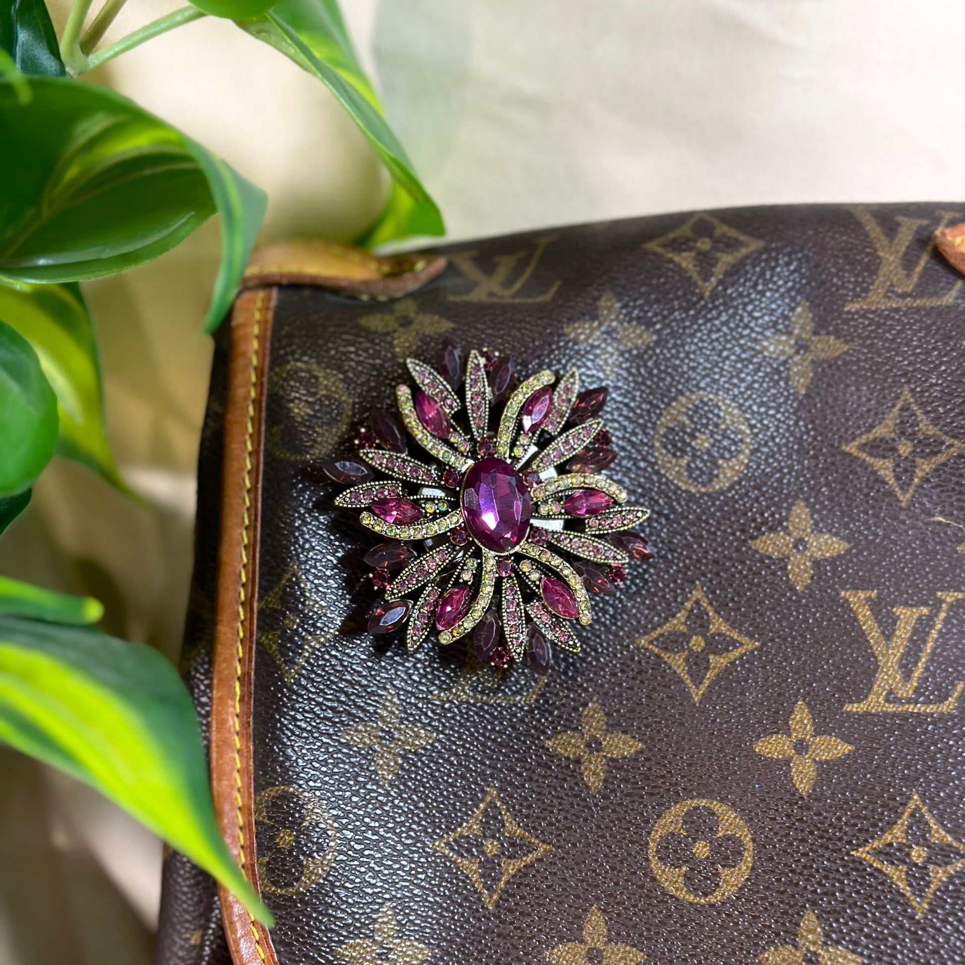 A beautiful purple stone broach that has been restored into a gorgeous New Vintage Handbags charm with all glass stones. Our strong magnet backings let you move them around with ease on your bag for a playful touch, The best part? Those magnetic charms are multi-use — they double as hat, sweater, or blazer accessories, adding a touch of art to whatever you wear. One-piece, endless possibilities.